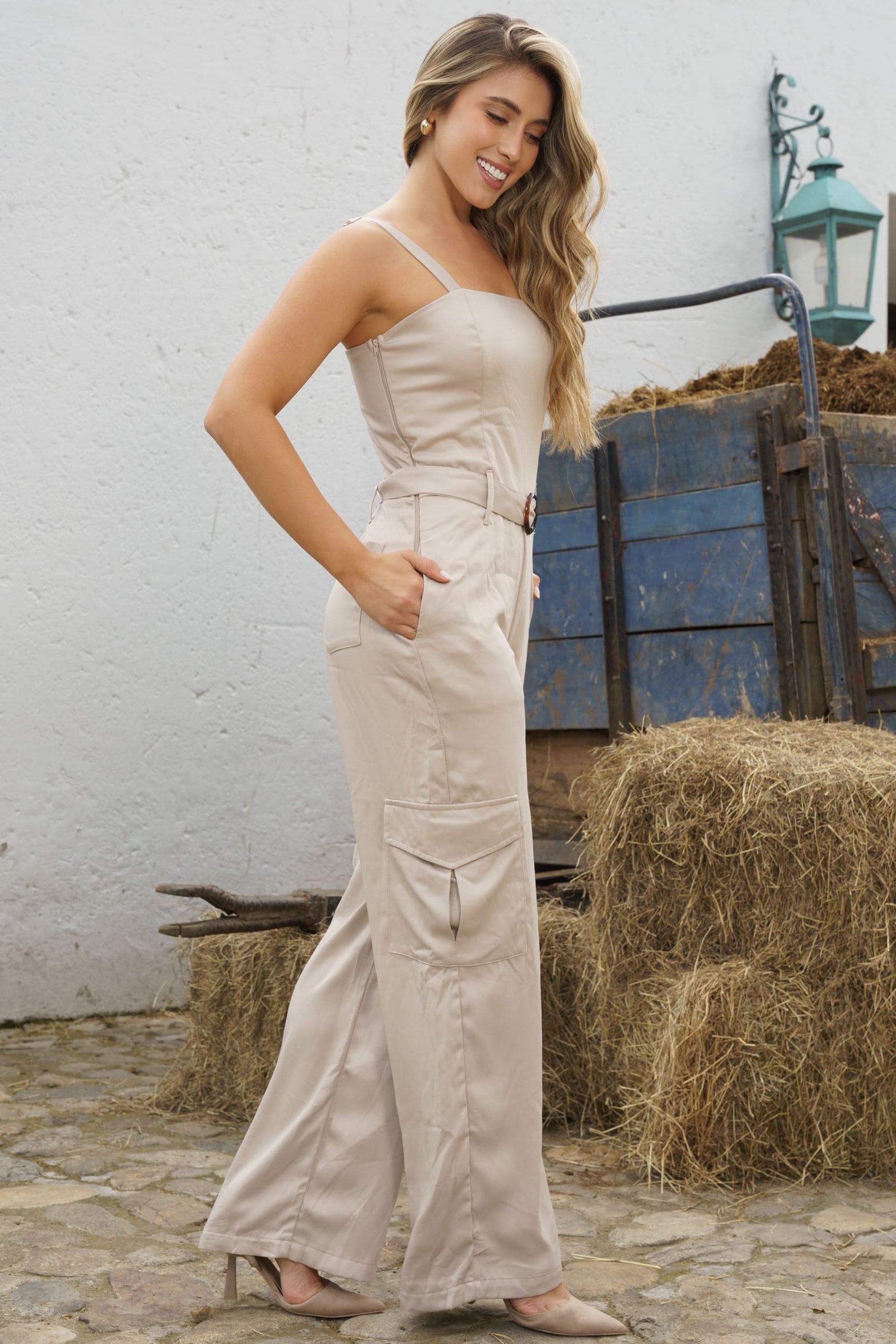 Un básico infaltable con un toque moderno. Este enterizo tipo cargo en tono beige claro es una prenda versátil, elegante y cómoda que realza tu silueta con un diseño limpio y femenino. Presenta escote recto, tirantes anchos, bolsillos laterales tipo cargo y un cinturón con hebilla decorativa que define la cintura de manera sutil. Su confección en tela ligera y fresca lo hace ideal para climas cálidos o para llevar con estilo durante todo el año. Perfecto para combinar con tacones, sandalias o zapatillas para un look casual o más sofisticado.