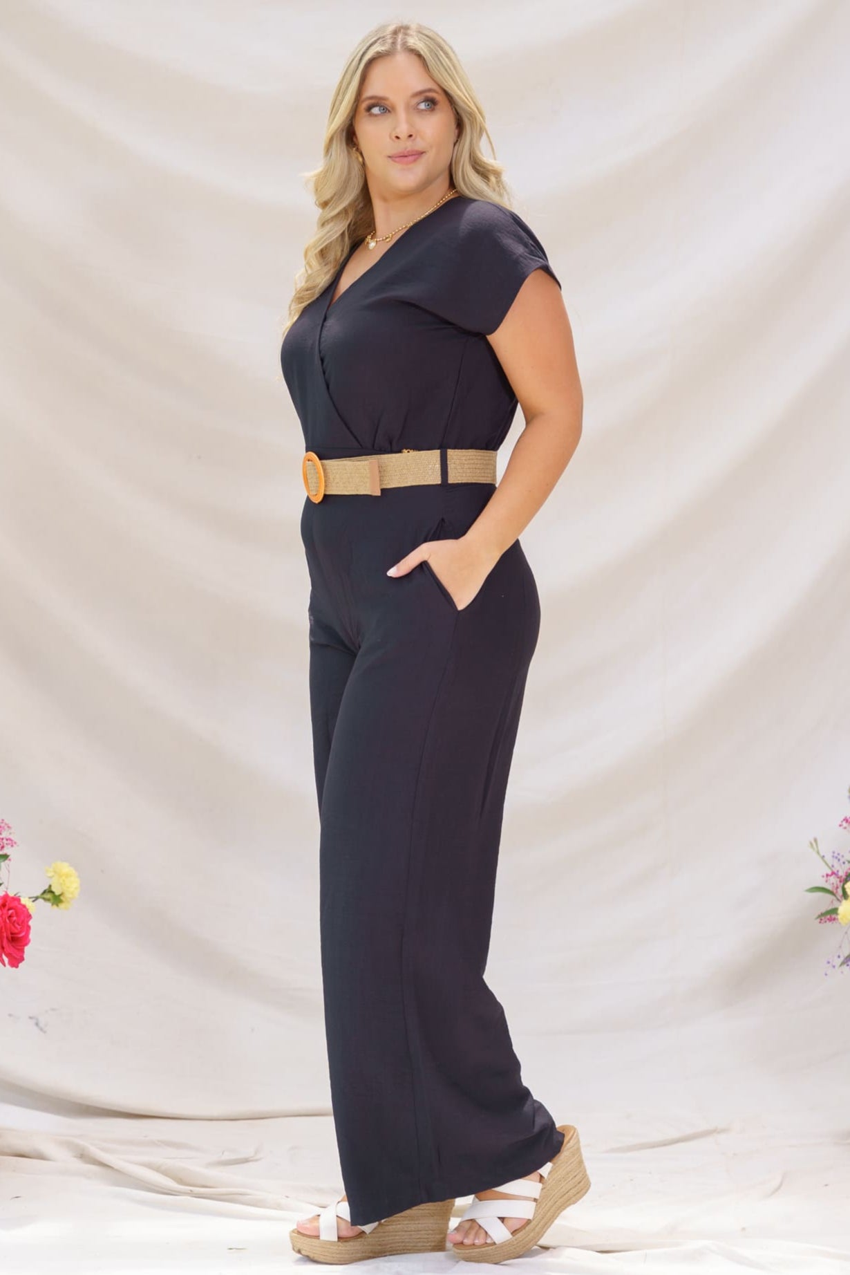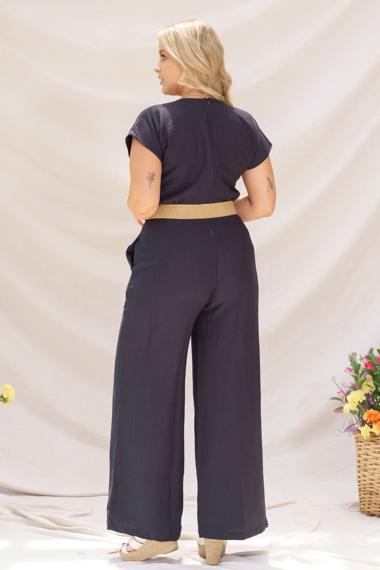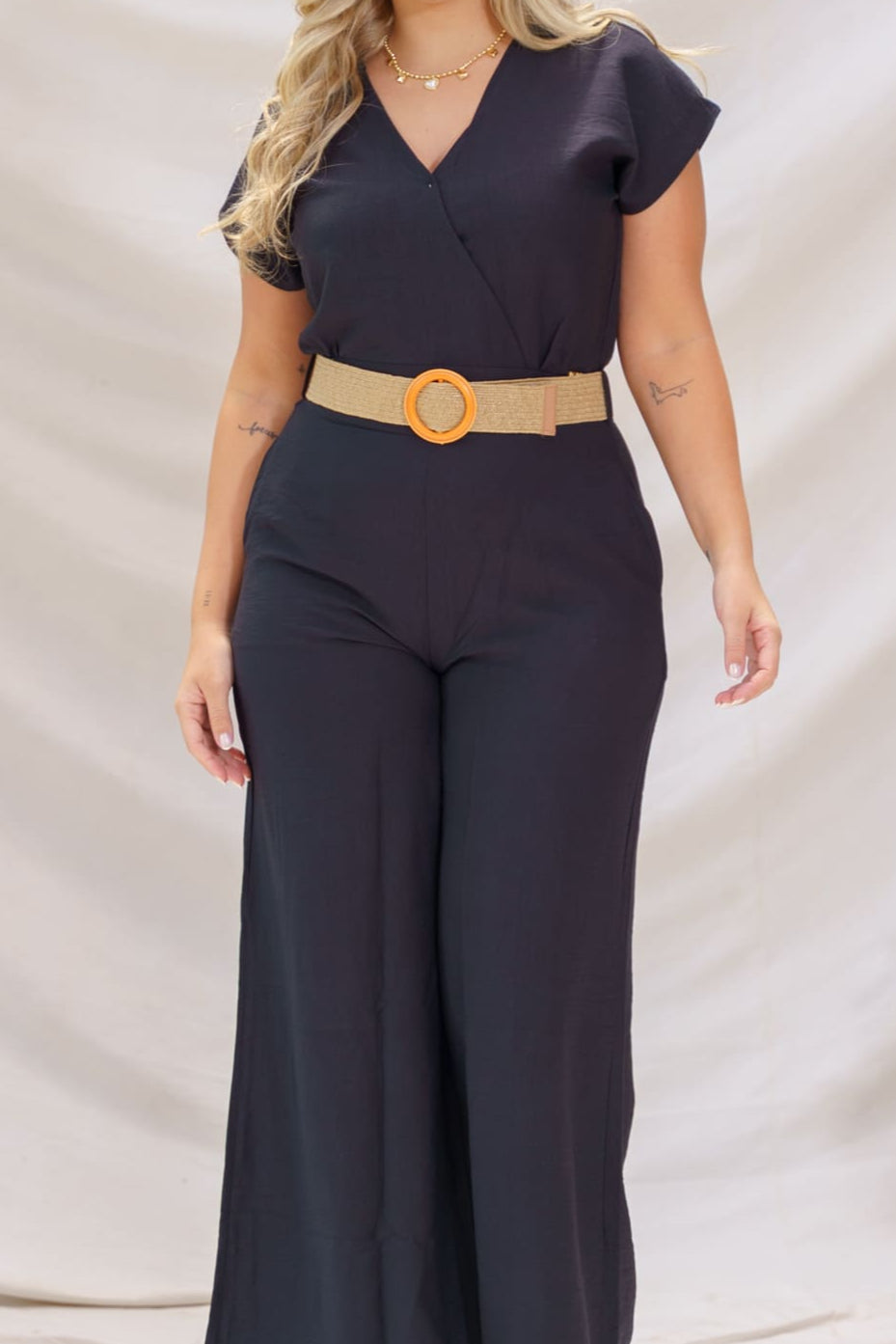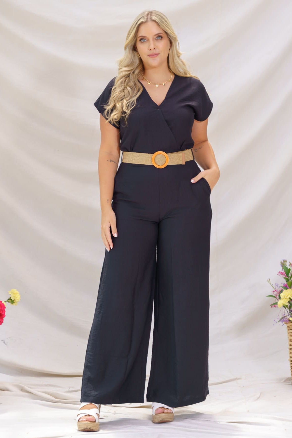 Luce sofisticada y fresca con nuestro enterizo Alisa, una prenda pensada para mujeres que buscan comodidad sin renunciar al estilo. Confeccionado en un tono negro, su diseño minimalista destaca por su escote en V cruzado que estiliza el cuello, mangas cortas, y un corte amplio en pierna tipo palazzo que brinda movimiento y fluidez al caminar.