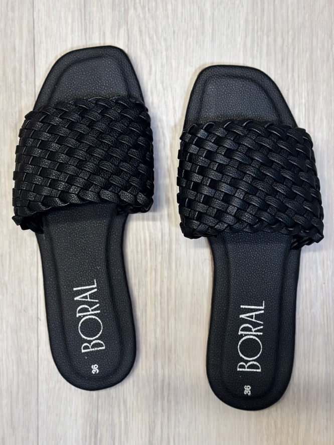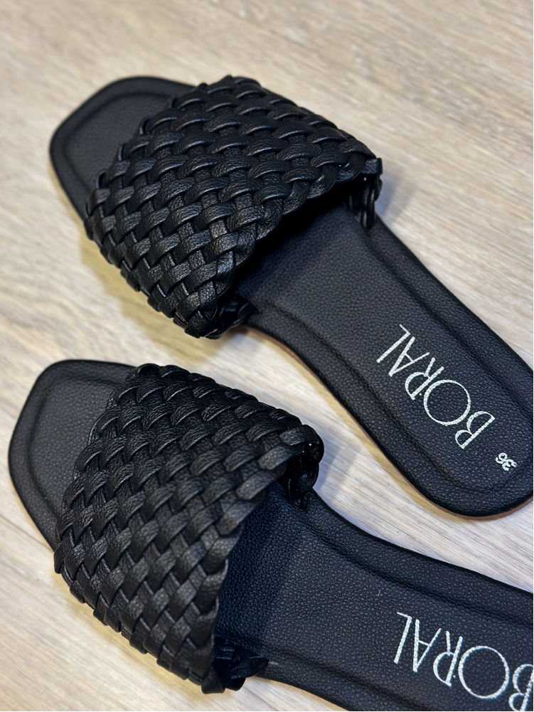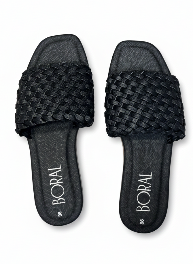 Sandalias planas estilo slip-on con punta cuadrada, diseñadas para brindar comodidad y un look moderno. Cuentan con una capellada ancha tejida en material sintético negro, que aporta textura y un acabado elegante. La plantilla es suave y ligera, ideal para uso diario y largas jornadas.