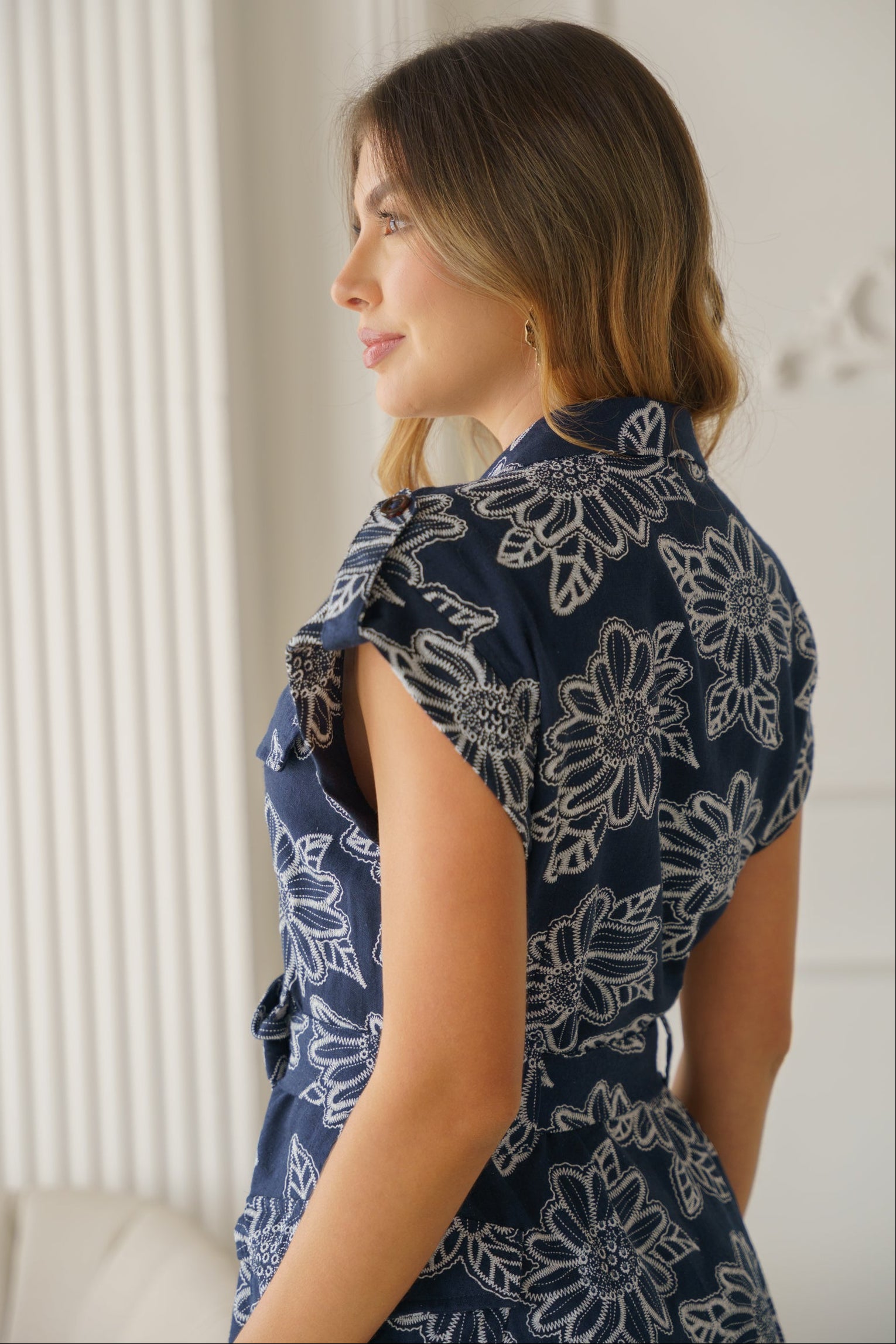 Este vestido largo tipo camisero destaca por su elegancia clásica y diseño atemporal. Su estampado floral en contraste sobre fondo azul marino aporta un look sofisticado y versátil, ideal para el día o para ocasiones especiales.