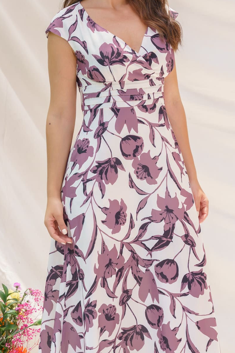 Romántico, fresco y femenino: el vestido largo "Irina" es una pieza imprescindible para esta temporada. Con un favorecedor escote en V cruzado y un corte en la cintura que define la silueta, este diseño destaca por su estampado floral en tonos morados sobre fondo blanco, evocando frescura y elegancia natural.