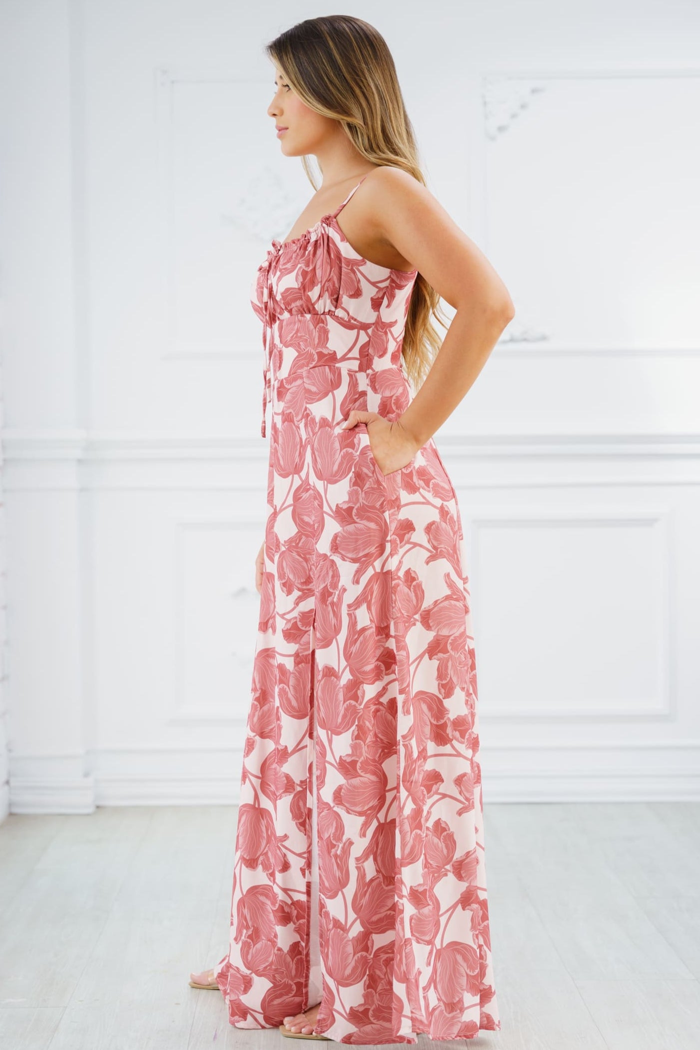 Tiene una silueta fluida de largo maxi que estiliza la figura, con detalle fruncido en el busto y lazo decorativo, que aporta un toque romántico y favorecedor. Sus tirantes delgados y el ajuste entallado en la cintura resaltan delicadamente la silueta, mientras la falda amplia brinda libertad de movimiento.