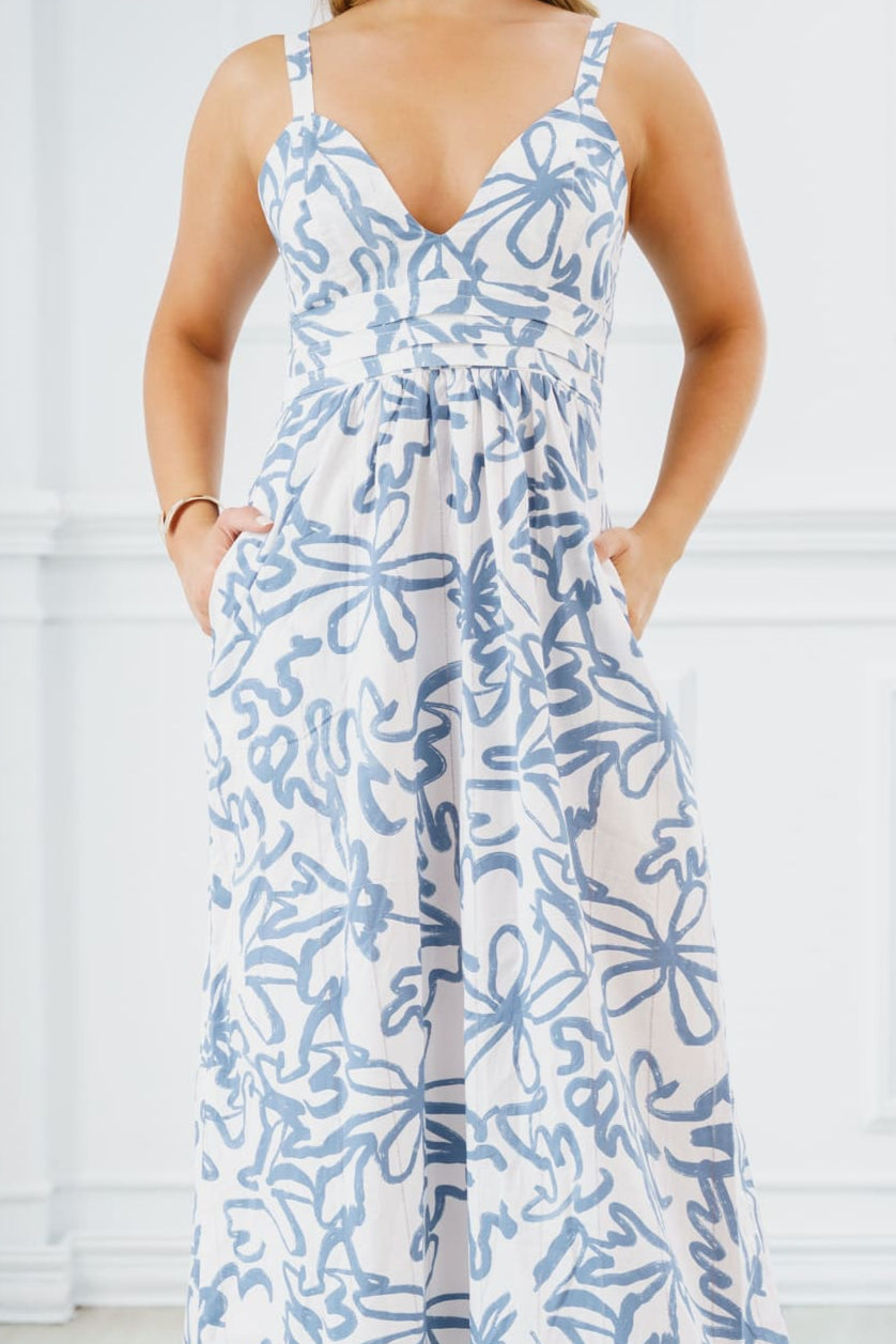 El estampado abstracto en tonos azul claro sobre fondo blanco le da un aire artístico y veraniego, ideal para días soleados, paseos o eventos casuales. Además, cuenta con bolsillos laterales funcionales que lo hacen aún más práctico.