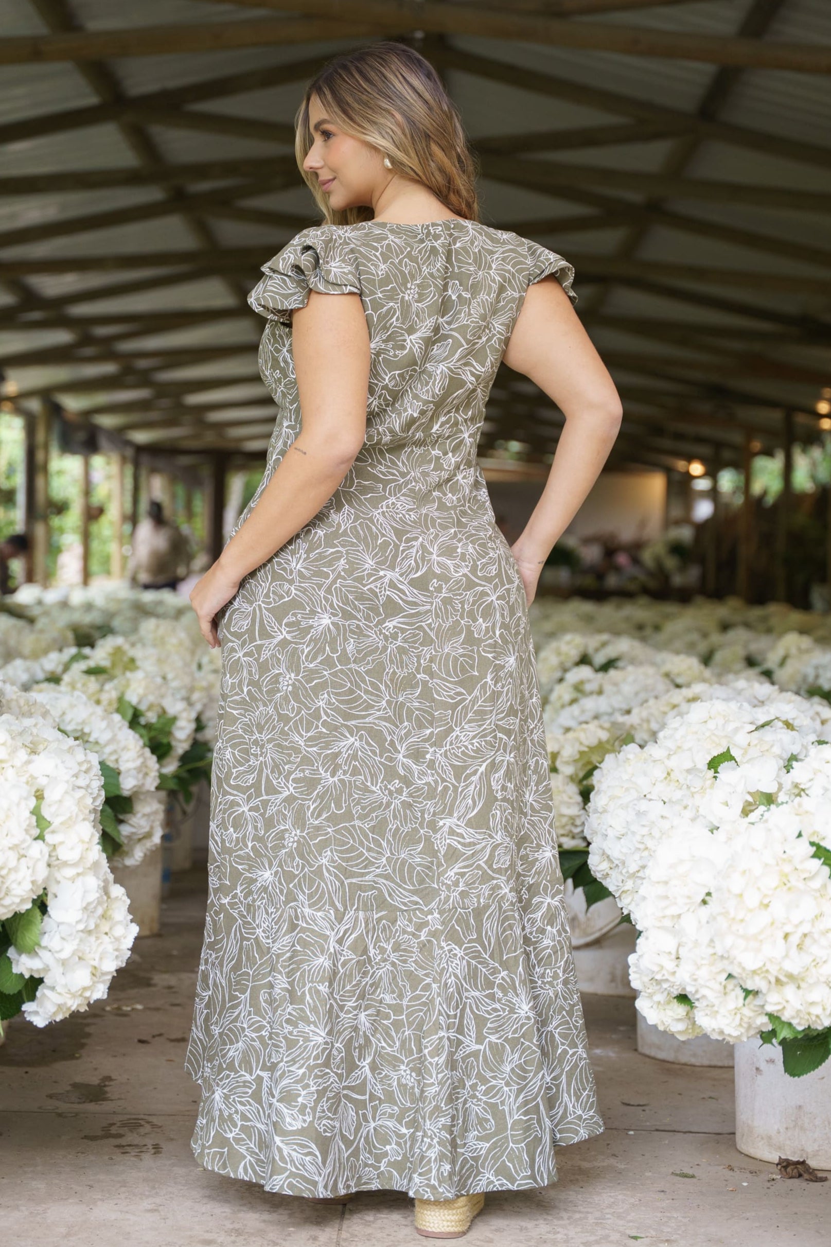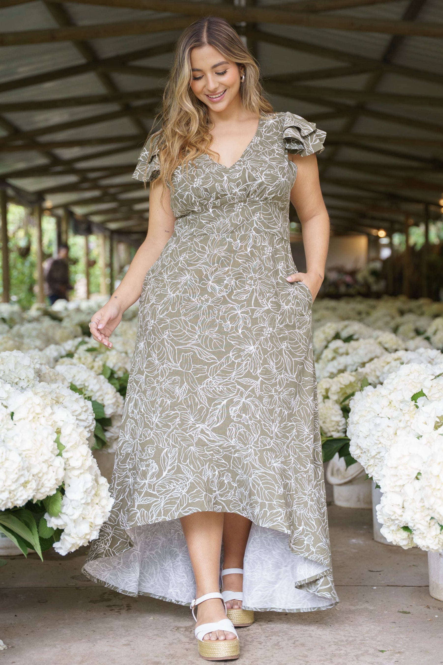 El vestido perfecto para sentirte femenina, fresca y cómoda. Este hermoso diseño de corte largo asimétrico (más corto al frente y largo atrás) destaca por su estampado floral blanco sobre fondo verde oliva, evocando un estilo natural y elegante. Cuenta con escote en V, mangas con volantes que aportan un toque romántico y bolsillos laterales funcionales. La silueta favorecedora y fluida lo convierte en una opción ideal para eventos al aire libre, paseos o reuniones casuales. Combínalo con sandalias o plataformas para un look fresco y encantador.